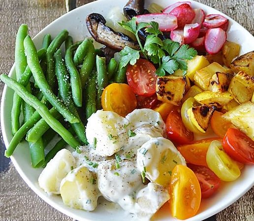1. Kyllingkjøtt med hvitløkdressing & grønnsaker.