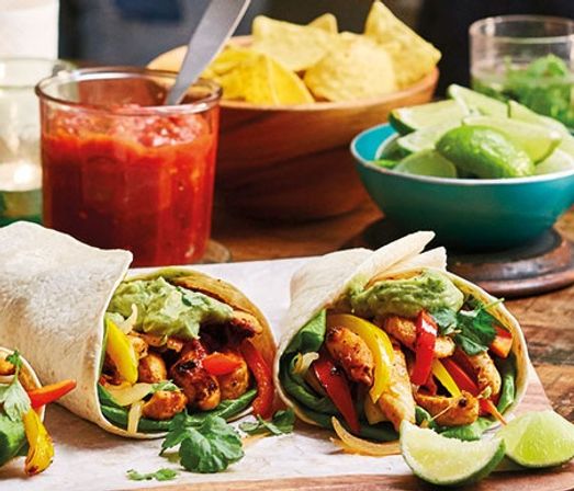 Kylling, tacokjøtt , hvetetortilla, tortillachips, salsa,